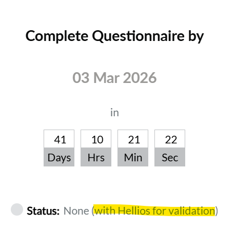 After submitting your questionnaire for validation, you will notice that all question fields are now locked for editing. Your questionnaire will remain in this state whilst Hellios validate your answers. If any of your answers require clarification, Hellios will notify you by email and your answers will be unlocked for editing.